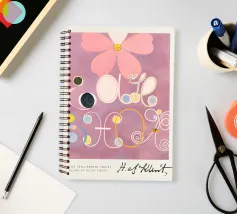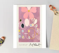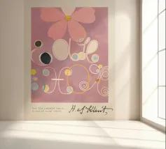 Questa suggestiva stampa d'arte presenta "The Ten Largest (No.5)" di Hilma af Klint, un'accattivante opera astratta del 1907. La composizione è collocata su un morbido sfondo lilla e comprende un grande ed etereo fiore rosa in alto. In basso, forme astratte di lettere, cerchi e spirali bianche, blu e gialle si intrecciano creando un senso di crescita organica e di simbolismo spirituale. Firmato "H. af Klint", questo lavoro mostra la visione astratta pionieristica di Klint, che esplora i temi delle fasi della vita. Questo poster digitale di alta qualità (7000x5000 pixel, 300 dpi) cattura magnificamente la bellezza mistica e la crescita di Klint.