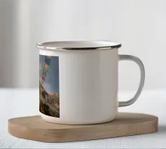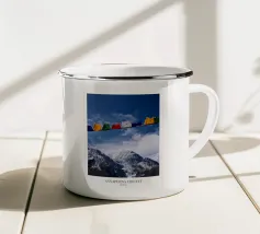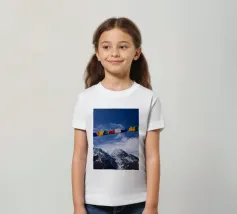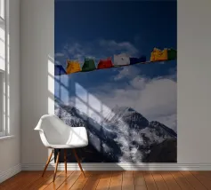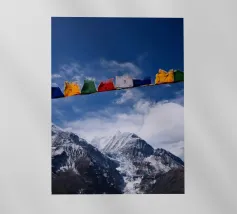 Le vibranti bandiere di preghiera tibetane sventolano nell'aria frizzante di montagna, sullo sfondo delle maestose cime innevate dell'Himalaya. Il cielo blu intenso e il terreno accidentato e glaciale creano un contrasto mozzafiato, catturando l'essenza spirituale e naturale della regione dell'Annapurna.