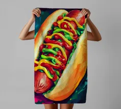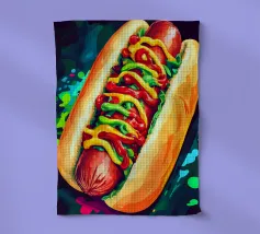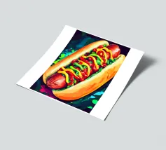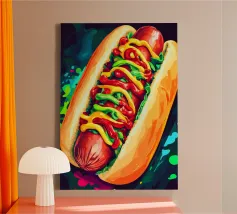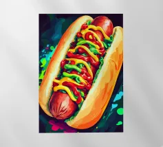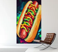 Questa immagine accattivante mostra un hot dog in stile pop art dinamico, ricoperto da fasci vibranti di ketchup, senape e colori verdi freschi. I colori vivaci e lo sfondo ad alto contrasto fanno sembrare il motivo quasi vivo e irradiano divertimento ed energia. Perfetto per gli appassionati di street food, per gli amanti della pop art e per gli spazi che traggono vantaggio da accenti audaci e colorati.
