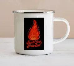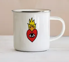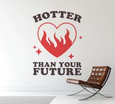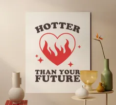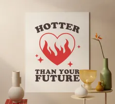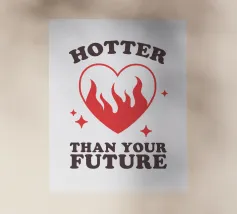 Un cuore stilizzato con fiamme all'interno è accompagnato dal testo in grassetto "Hotter Than Your Future". Il design è caratterizzato da una tavolozza di colori rossi e bianchi che conferiscono un contrasto sorprendente.
