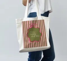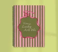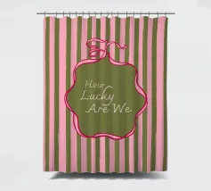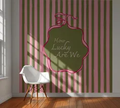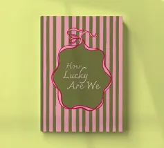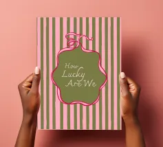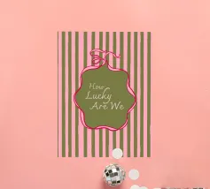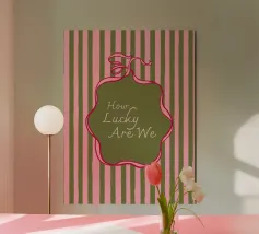Un'incantevole opera d'arte in stile coquette a righe rosa e oliva con la frase "How Lucky Are We", perfetta per regali edificanti e dolci decorazioni estetiche.