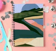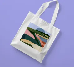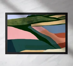 Forme stilizzate in una varietà di colori si uniscono per raffigurare un paesaggio astratto con quello che sembra essere un grande sole o una luna sullo sfondo. Gli strati di colore creano un senso di profondità e la giustapposizione di toni caldi e freddi suggerisce diversi elementi naturali.