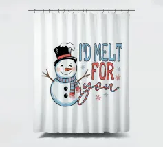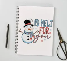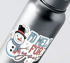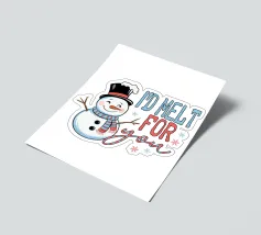 Un allegro pupazzo di neve con cappello a cilindro e sciarpa saluta, accompagnato dal testo scherzoso "Mi scioglierei per te", che mette in risalto il gesto caloroso del pupazzo di neve e i giocosi fiocchi di neve intorno al testo.