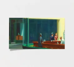 Edward Hopper's Nighthawks (1942) - Iconica stampa d'arte americanaEntra nella solitudine senza tempo di Nighthawks di Edward Hopper, il capolavoro più importante dell'arte americana del XX secolo. Questo dipinto del 1942 cattura quattro sconosciuti in una luminosa tavola calda del centro, sospesi nella tranquilla tensione di una notte insonne. Con la sua illuminazione cinematografica, le linee geometriche nitide e il vuoto ossessionante, Nighthawks incarna l'alienazione urbana e la poesia delle storie non dette. Un'opera imperdibile per i collezionisti di arte moderna e per gli amanti delle atmosfere noir.