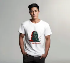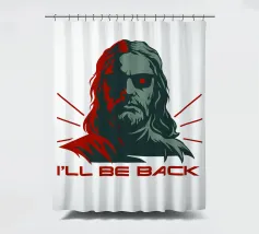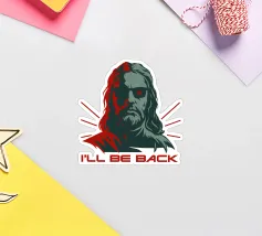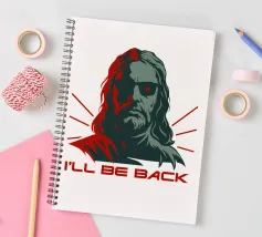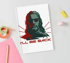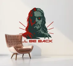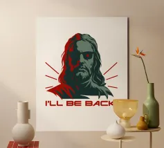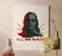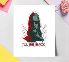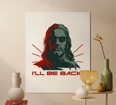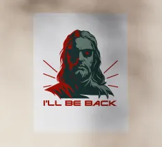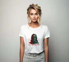 Un'immagine monocromatica combina elementi di un personaggio noto con una frase famosa, creando una fusione unica. La figura centrale ha un aspetto stilizzato, quasi metallico, evidenziato da accenti rossi e da un effetto ombra. L'affermazione "I'LL BE BACK" è ben visibile sotto l'immagine, a rafforzare il tema audace.