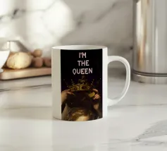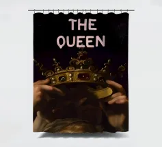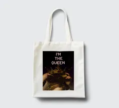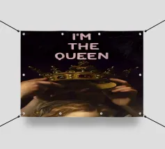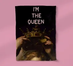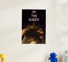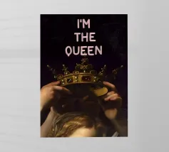 Un dipinto che raffigura una persona che viene incoronata con una corona d'oro ornata di gioielli. Il testo "I'M THE QUEEN" (Sono la regina) è scritto in lettere rosa acceso sopra l'opera d'arte.