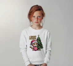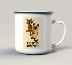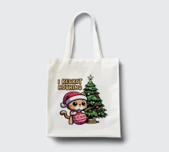 Un simpatico gatto con un cappello da Babbo Natale tiene in mano un ornamento natalizio accanto a un albero decorato. Il testo in grassetto sopra il gatto recita "I REGRET NOTHING", aggiungendo umorismo alla scena festiva.