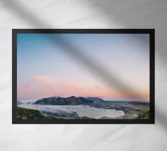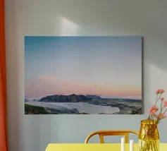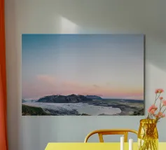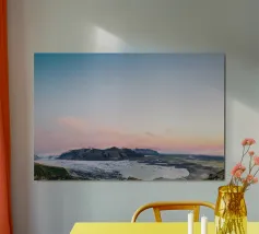 L'abbraccio mozzafiato dell'alba sul paesaggio grezzo e selvaggio dell'Islanda. Questa immagine accattivante, immersa in un tenue crepuscolo rosa e blu, mostra il drammatico contrasto tra antichi ghiacciai e serene lagune glaciali. Le montagne lontane si ergono come stoiche sentinelle, riflettendo il bagliore etereo di un nuovo giorno. Una scena di profonda tranquillità e di impressionante bellezza naturale, questa stampa evoca un senso di pace, meraviglia e la potente arte della natura selvaggia islandese. Perfetta per portare un tocco di serena maestosità e di fuga ispiratrice in qualsiasi spazio.