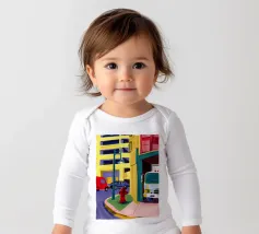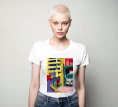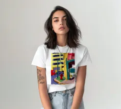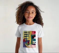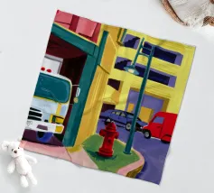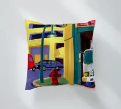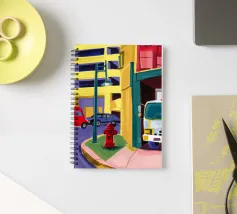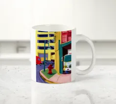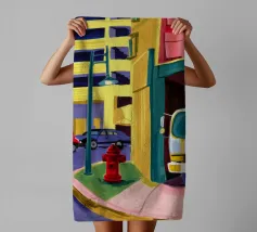 Un idrante rosso vivo e una cassetta postale si trovano all'angolo della città, con i loro colori brillanti che risaltano sugli edifici stilizzati e sulla strada, una celebrazione dei dettagli urbani.