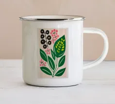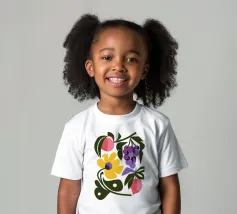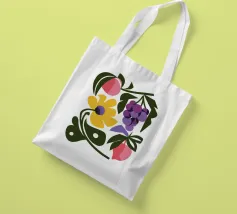 Un'illustrazione astratta e stilizzata di fiori viola e gialli, che ricordano l'uva su una vite. Le forme organiche e vorticose creano un senso di movimento e danza su uno sfondo bianco e pulito.
