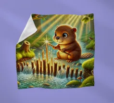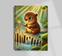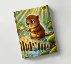 Una commovente illustrazione a fumetti di un cucciolo di castoro che costruisce una magica diga con bastoncini luminosi in una tranquilla foresta. Il castoro, con la sua morbida pelliccia marrone e gli occhi espressivi, lavora diligentemente mentre la luce del sole filtra attraverso il verde lussureggiante, creando un'atmosfera dorata e sognante. Nelle vicinanze, piccole creature della foresta osservano ammirate, aggiungendo un fascino stravagante.