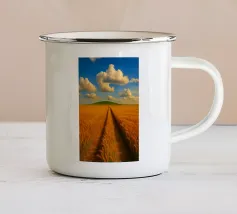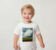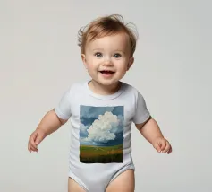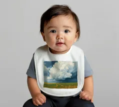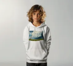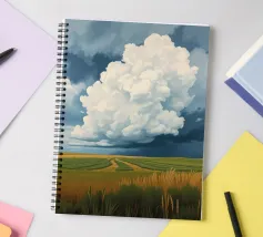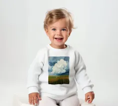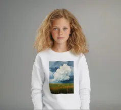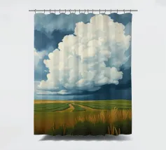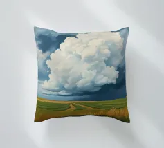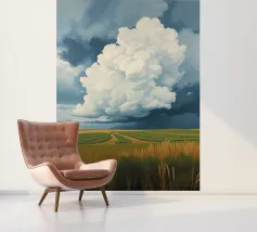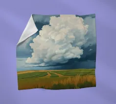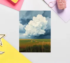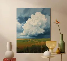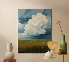 Un'imponente testa di tuono svolazzante domina il cielo, con la sua bianca brillantezza che contrasta drammaticamente con i grigi cupi e tempestosi e i blu profondi del fronte in avvicinamento. In basso, si estende la vasta prateria inondata di sole, un arazzo di erbe dorate e campi verdeggianti. Un sentiero tortuoso e sterrato attraversa il paesaggio, conducendo l'occhio più in profondità nella scena, accennando a un viaggio attraverso questa terra ampia, bella e leggermente presagita. L'opera cattura la presenza potente, quasi spirituale, del cielo e la sua eterna danza con la terra sottostante.