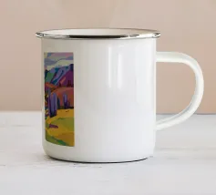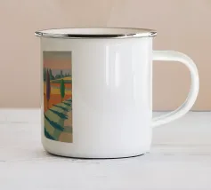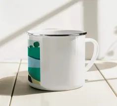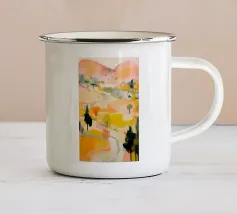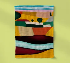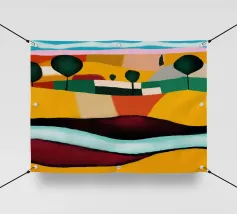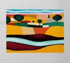 I colori vivaci formano un paesaggio astratto con alberi stilizzati sullo sfondo di dolci colline e di un cielo sereno. Gli strati distinti di colori suggeriscono diversi elementi naturali, dall'acqua alla terra alla vegetazione.