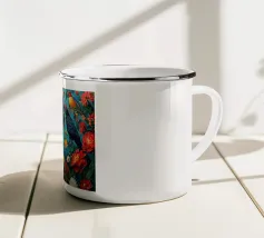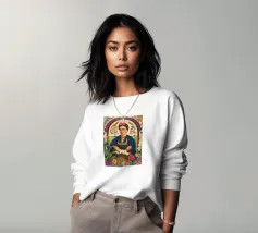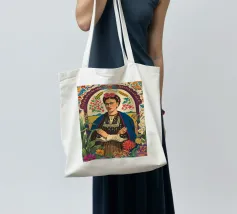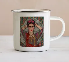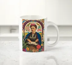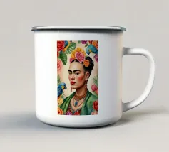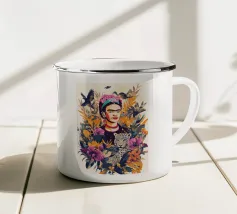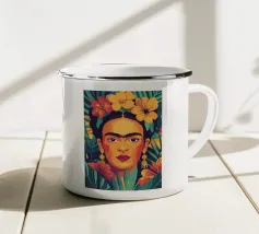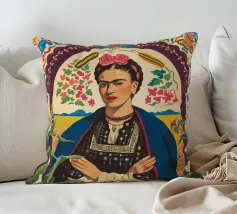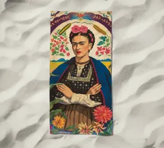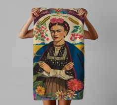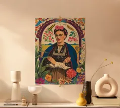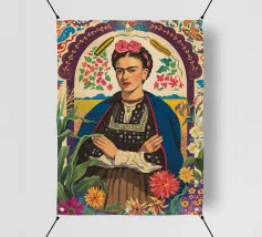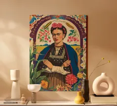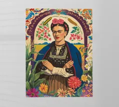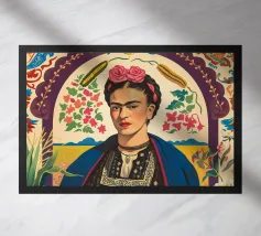Questo vibrante ritratto di Frida Kahlo la ritrae in costume tradizionale messicano con una colorata corona di fiori che incarna il suo legame con il folklore e il simbolismo femminista.