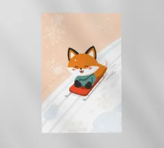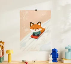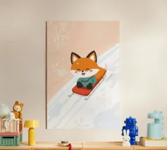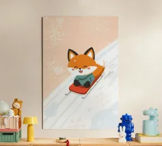 Voxy corre lungo una collina innevata con pura gioia invernale. I colori tenui, il movimento giocoso e l'accogliente atmosfera invernale rendono questo pezzo perfetto per le camere dei bambini e per le decorazioni festive.