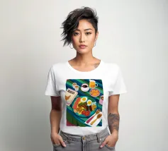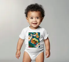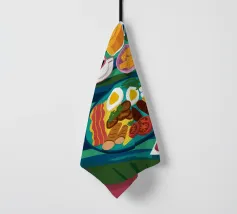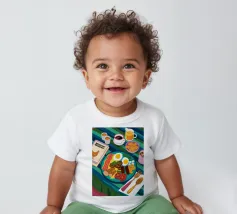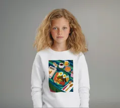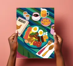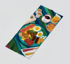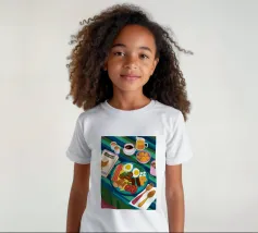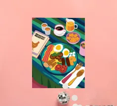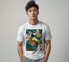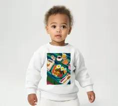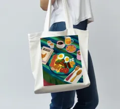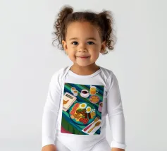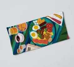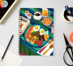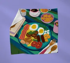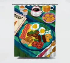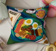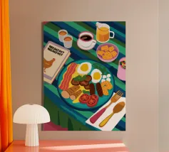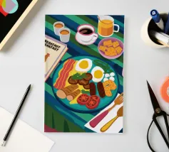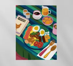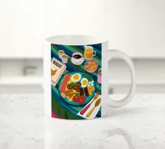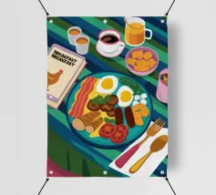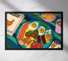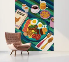 Una visione dall'alto di una classica colazione all'inglese che fa venire l'acquolina in bocca. Ogni elemento, uova, salsiccia, fagioli, funghi e pane tostato, è reso in modo delizioso e dettagliato, rendendo il massimo tributo a questo pasto iconico e sostanzioso.