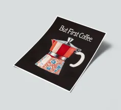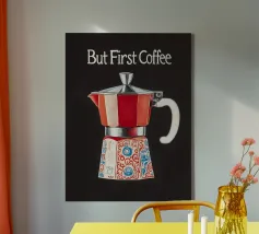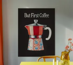 "Per gli amanti del caffè, la giornata inizia con un forte espresso dalla caffettiera moka - 'Ma prima, il caffè! Questa illustrazione minimalista in stile vintage cattura perfettamente la cultura italiana del caffè e porta l'arte dell'espresso retrò nella vostra casa".