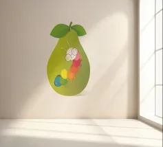 Un piccolo bruco saggio con segmenti arcobaleno fa capolino da una pera, indossando grandi occhiali rotondi. Ricco di colori, fascino e un pizzico di umorismo, questo disegno allegro è perfetto per i bambini, gli appassionati di natura e tutti coloro che amano l'arte giocosa e in stile libro di fiabe.
