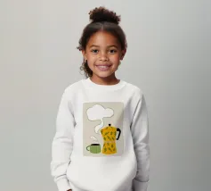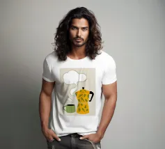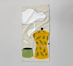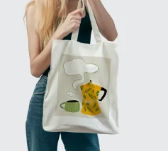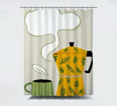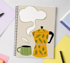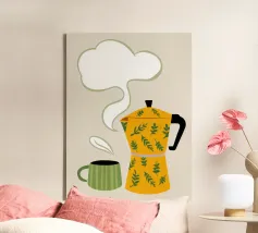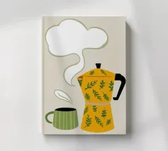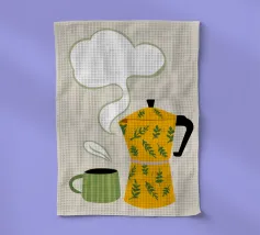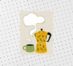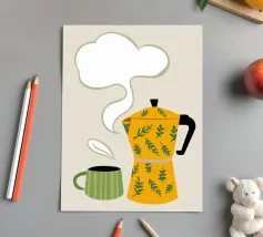 Un'illustrazione stravagante mostra una caffettiera gialla con una tazza verde, con una grande bolla vocale vuota che galleggia sopra, pronta per i vostri pensieri alimentati dal caffè.