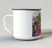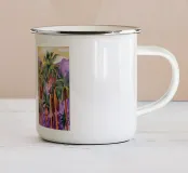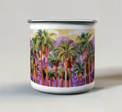 Un boschetto di palme è raffigurato in uno stile astratto e prismatico, con strisce verticali di colori vivaci e illuminati, viola, rosa e gialli, che creano una scena tropicale moderna ed energica.