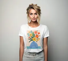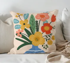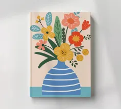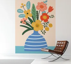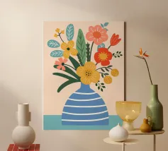 Questo vivace disegno raffigura un colorato bouquet di fiori in un vaso decorativo blu. I colori armoniosi - giallo, rosso, blu e verde - conferiscono al motivo un aspetto fresco e allegro. Ideale per accessori moderni per la casa, come murales, cuscini o tazze, questo disegno porta la primavera e la gioia di vivere in ogni stanza. È perfetto come decorazione per il soggiorno, l'ufficio o come regalo elegante per gli amanti dei fiori e dell'arte. Il look minimalista e disegnato a mano si adatta perfettamente a diversi stili di interni.
