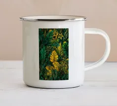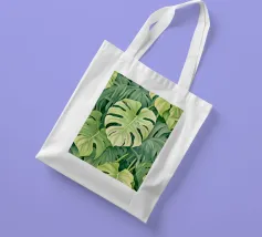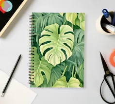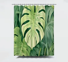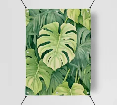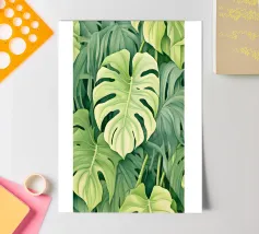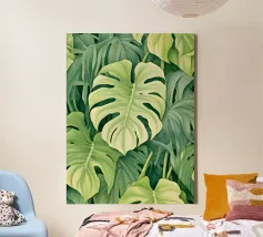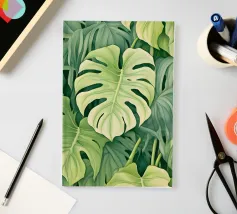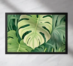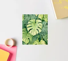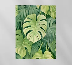 Un'accattivante illustrazione di lussureggianti foglie di Swiss Cheese Plant, che mostrano le loro caratteristiche fenestrazioni e le vibranti sfumature verdi. Questa opera d'arte evoca un senso di tranquillità e bellezza naturale.
