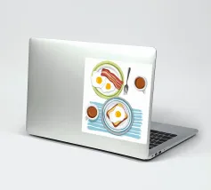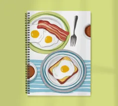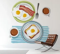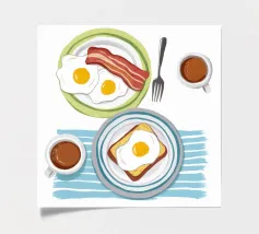 Una classica illustrazione dall'alto verso il basso di una colazione con uova, pancetta, pane tostato e due tazze di caffè. Lo stile è pulito, moderno e senza tempo.