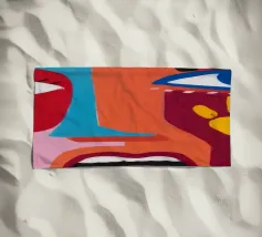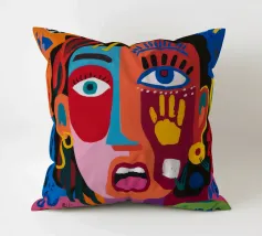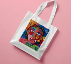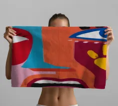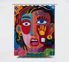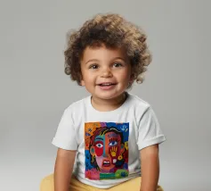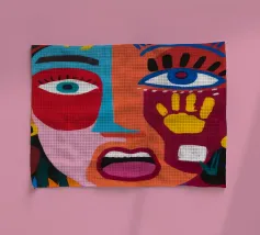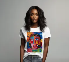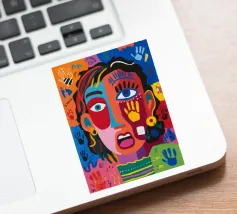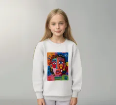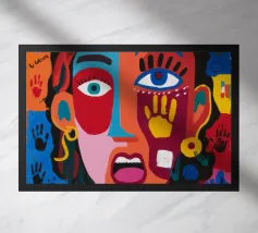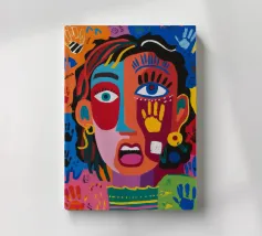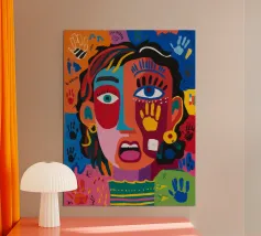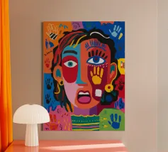 Un volto sorprendente circondato da impronte di mani colorate e tratti astratti dinamici. La composizione visiva, giocosa ma intensa, rende il dipinto accattivante ed energico.