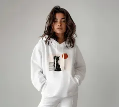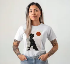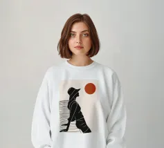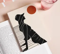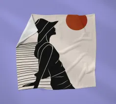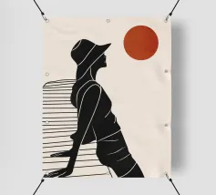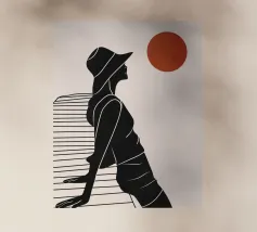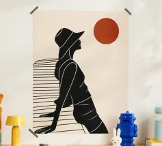 Una donna siede su un molo e si gode il calore del sole. La scena calma cattura un momento di tranquillità in riva al mare. Le linee minimali e i toni della terra conferiscono a quest'opera un'atmosfera morbida e senza tempo.