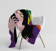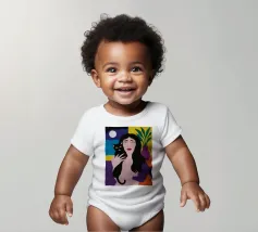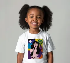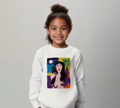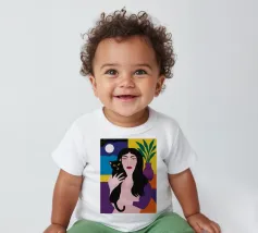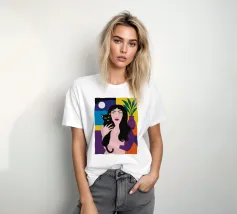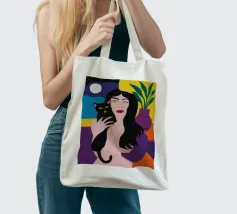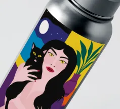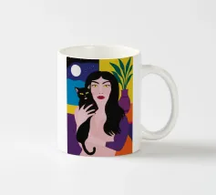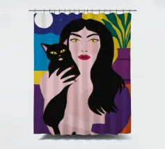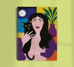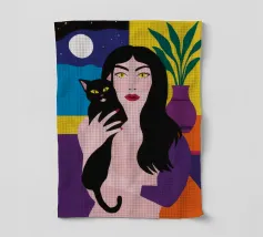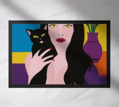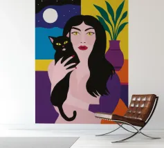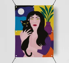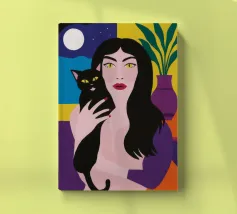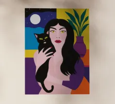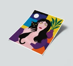 Un suggestivo ritratto di donna dagli accattivanti occhi verdi tiene in braccio un elegante gatto nero, su uno sfondo scuro con luna crescente, che evoca un'aura di mistero, eleganza e incanto notturno.