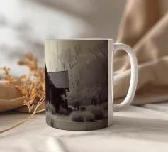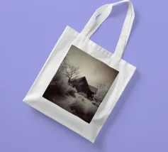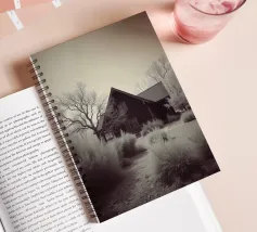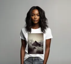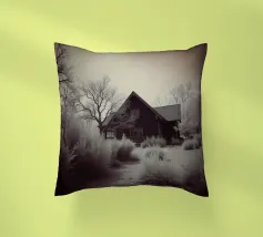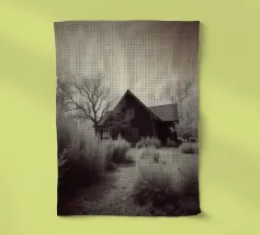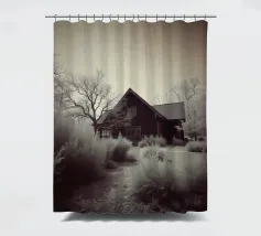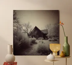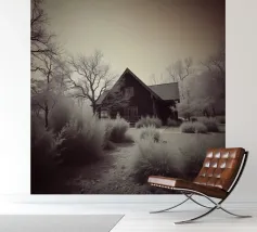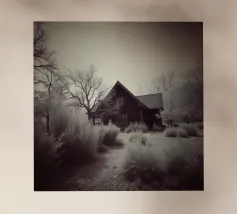 Una casa rustica in legno si erge tra erbe alte e alberi senza foglie, creando un'atmosfera tranquilla in un'area rurale. La scena evoca un senso di tranquillità e solitudine.
