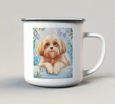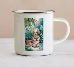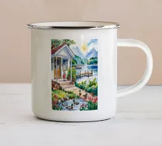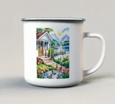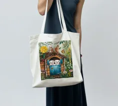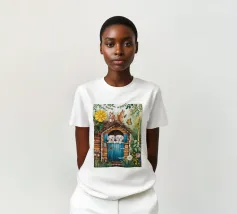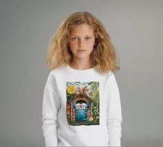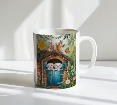 Questa opera d'arte mostra un'accogliente casa di legno con una porta blu, affiancata da due cani seduti davanti. Un gatto e uno scoiattolo sono appollaiati sul tetto, circondati da piante rigogliose, fiori e un imponente girasole, che emanano calore e fascino.
