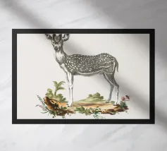 Entrate nello studio dei primi naturalisti con questa elegante incisione del cervo assiolo. Il blocco inferiore presenta il nome latino in grassetto rosso e i dettagli originali del libro per un'autentica sensazione vintage.