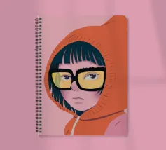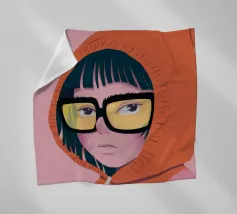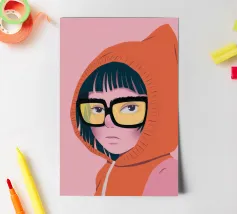 Un ritratto lunatico di una persona che indossa una felpa rossa arancione con cappuccio tirato su e grandi occhiali gialli colorati, creando un senso di anonimato urbano e di fredda introspezione.