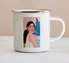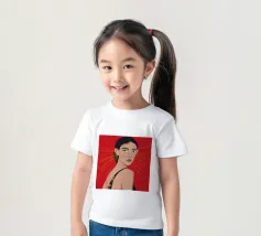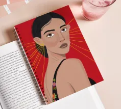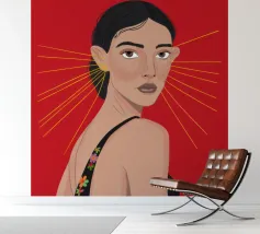 Un suggestivo ritratto di donna che si guarda alle spalle con uno sguardo intenso e diretto, con il volto illuminato da linee luminose su uno sfondo rosso intenso, che trasmette potere e sicurezza.