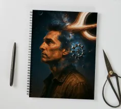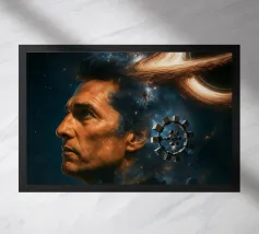 Viaggiate nel cosmo con questo poster ispirato a Interstellar con l'astronauta Cooper, il maestoso buco nero Gargantua e una galassia di stelle. Un omaggio al capolavoro fantascientifico di Christopher Nolan, che fonde spazio, cinema e astronomia in un epico universo cinematografico.