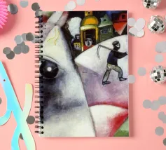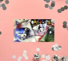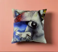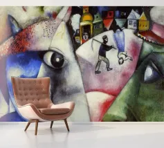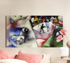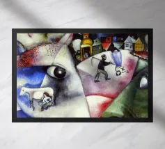 Questo iconico dipinto a olio del 1911 di Marc Chagall è un primo esempio dell'influenza cubista sul simbolismo e raffigura un paesaggio fantastico di figure interconnesse. Presenta immagini frammentate tratte dalla memoria dell'artista della sua città natale russa, tra cui un contadino, un occhio luminoso e una mucca che munge. La composizione onirica esplora i temi dell'amore, della memoria e della nostalgia per una vita più semplice.