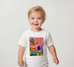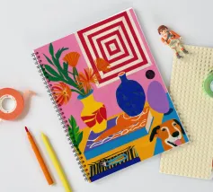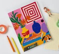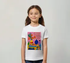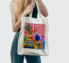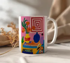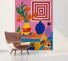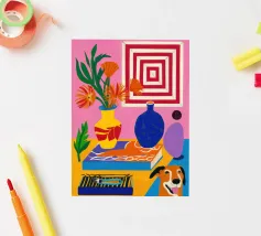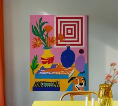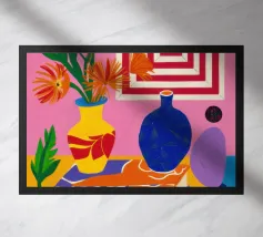 Una natura morta astratta audace e vibrante con un vaso blu, un motivo geometrico rosso e altre forme colorate. La composizione è energica, moderna e ha una qualità ipnotica e opartistica.