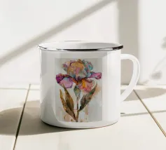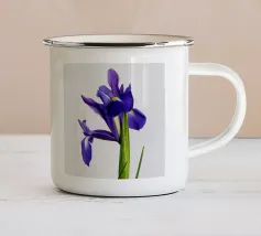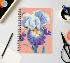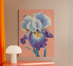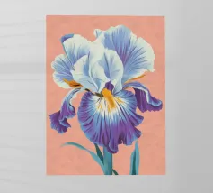 Una rappresentazione dettagliata e vibrante di un singolo fiore di iris in piena fioritura, che mostra i suoi intricati petali nei toni del blu, del viola, del bianco e del giallo. L'attenzione si concentra sulla maestosa bellezza del fiore.