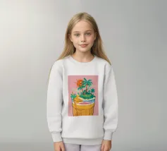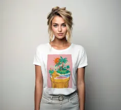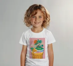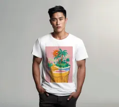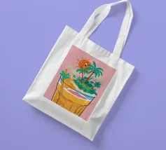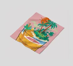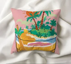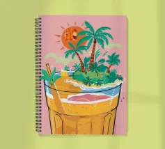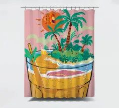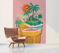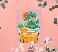 Un'isola tropicale con palme e onde dell'oceano si trova all'interno di un bicchiere di tè freddo sotto un sole splendente.