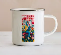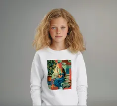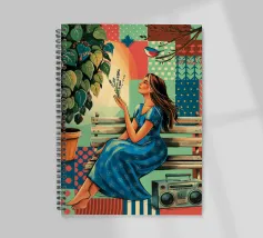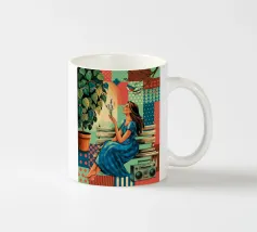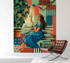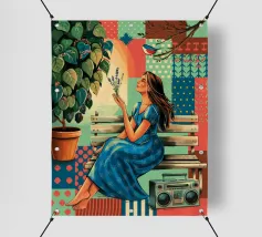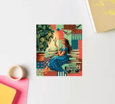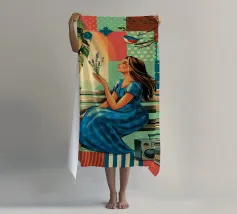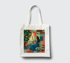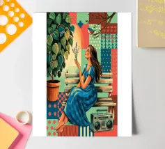 Una donna in abito blu siede su una pila di libri, tenendo in mano una lampadina incandescente. Lo sfondo è caratterizzato da motivi patchwork, che creano un'atmosfera stravagante e intellettuale.