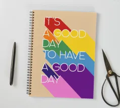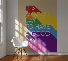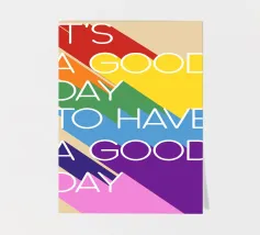 Un design tipografico luminoso ed edificante che presenta la frase "It's a Good Day to Have a Good Day" in un carattere elegante e moderno su strisce arcobaleno in grassetto con effetto ombra. Su uno sfondo neutro, questo disegno irradia positività, felicità ed energia. Perfetto per l'arredamento di case colorate, uffici e regali che diffondono gioia e ottimismo. Creato da showmemars