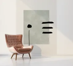 Opera d'arte japandi astratta e moderna di forma rettangolare con pennellate e texture nere. Arte minimalista in verde salvia per uno stile di vita bohémien, bohémien, industriale, japandi e moderno.