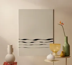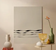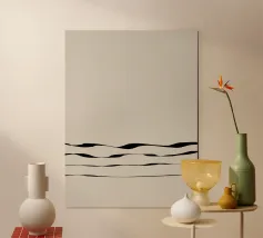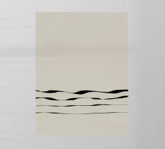 Opera d'arte minimalista giapponese con linee nere. Opera d'arte minimalista giapponese con graziose pennellate in nero e sfondo beige. Opera d'arte moderna e astratta di calligrafia giapponese che si adatta bene a vari stili abitativi, come quello giapponese, industriale, moderno, essenziale e naturale. Le diverse pennellate conferiscono all'opera un aspetto minimalista che attira l'attenzione. Se vi piace la semplicità e la forza.