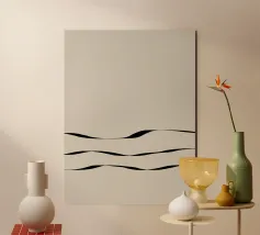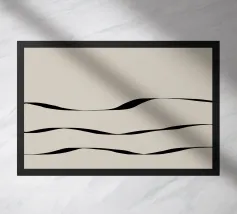 Opera d'arte minimalista giapponese con tre linee nere. Opera d'arte minimalista giapponese con graziose pennellate in nero e sfondo beige. Opera d'arte moderna e astratta di calligrafia giapponese che si adatta bene a vari stili abitativi, come quello giapponese, industriale, moderno, essenziale e naturale. Le diverse pennellate conferiscono all'opera un aspetto minimalista che attira l'attenzione. Se vi piace la semplicità e la forza.