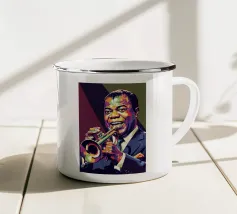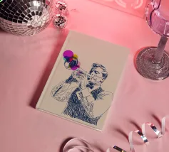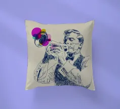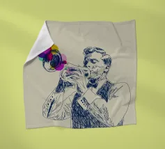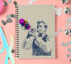 Lo schizzo a mano libera di un suonatore di tromba cattura l'essenza del jazz e del soul. Disegnata con espressivi tratti di inchiostro blu, la figura si china leggermente in avanti, assorta nell'atto di suonare. L'ottone dorato della tromba immaginata è ripreso visivamente da cerchi astratti dai toni caldi - ambra, rosso, viola intenso e arancione - che fluttuano e turbinano intorno al musicista. Queste esplosioni di colore evocano le onde sonore e l'intensità emotiva della musica dal vivo, fondendo energia ed eleganza.