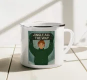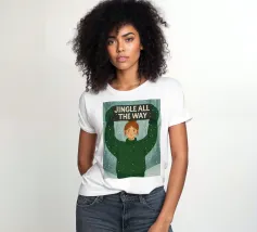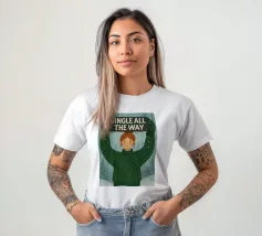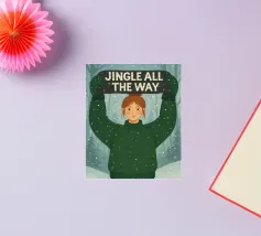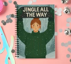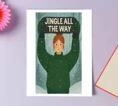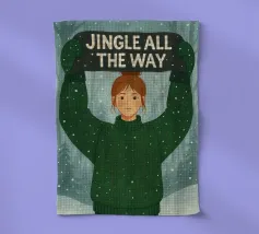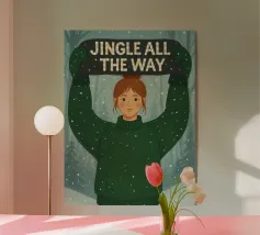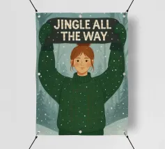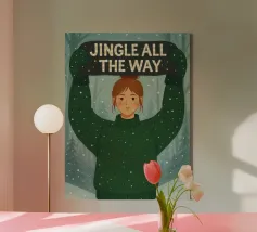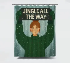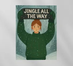 Arte natalizia di un'accogliente scena invernale con una giovane donna in piedi in una foresta innevata. Indossa uno spesso maglione natalizio verde bosco. La donna regge la sua sciarpa lavorata a maglia con la scritta "JINGLE ALL THE WAY" in grassetto, color crema. La frase "JINGLE ALL THE WAY" è un riferimento alla famosa canzone natalizia "Jingle Bells", che evoca l'allegria e lo spirito gioioso delle feste. Il maglione verde di Natale e lo sfondo innevato simboleggiano l'inverno e le tradizioni natalizie, suggerendo calore e celebrazione.
