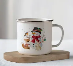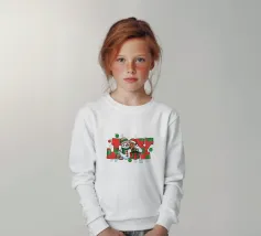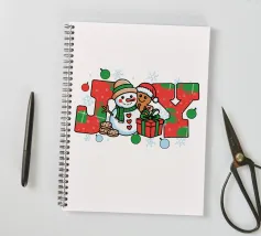 Un allegro pupazzo di neve e un omino di pan di zenzero si trovano accanto a una grande scritta rossa "JOY" ornata da fiocchi di neve e circondata da decorazioni natalizie. Scatole regalo e ornamenti festosi completano il tema stagionale.