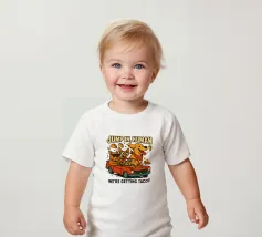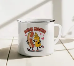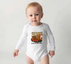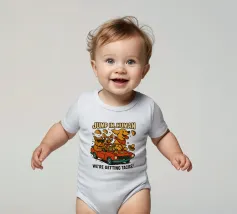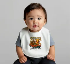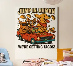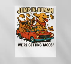 Due allegri cani viaggiano su una decappottabile rossa, circondati da taco volanti e indossando occhiali da sole e cappelli. Un testo in grassetto sopra di loro invita gli spettatori a partecipare alla loro avventura a base di taco.
