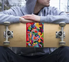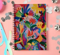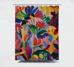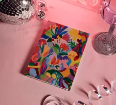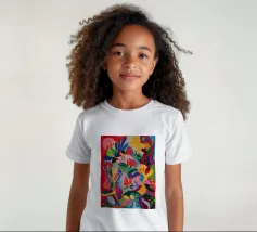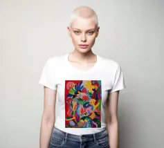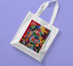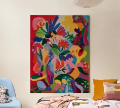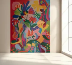 Una composizione astratta dai colori vivaci che suggerisce una fitta giungla o una scena floreale, con forme sovrapposte in rossi, blu, verdi, gialli e rosa vibranti.